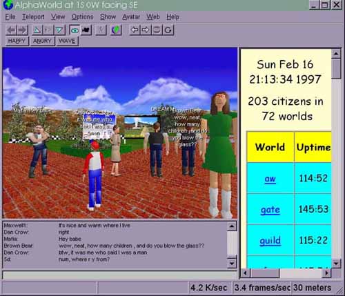 The Active Worlds are some of the most advanced virtual worlds in digital space. Users of avatar worlds are often called citizens, a sign that they should be respected as members of a community. In AlphaWorld, you can chat with other citizens and attend social happenings. Above all, you can build in AlphaWorld! Building can be done by any citizen on any free land or by special arrangement in a number of parallel planets called Active Worlds. In fact, AlphaWorld is just one of over 200 Active Worlds.